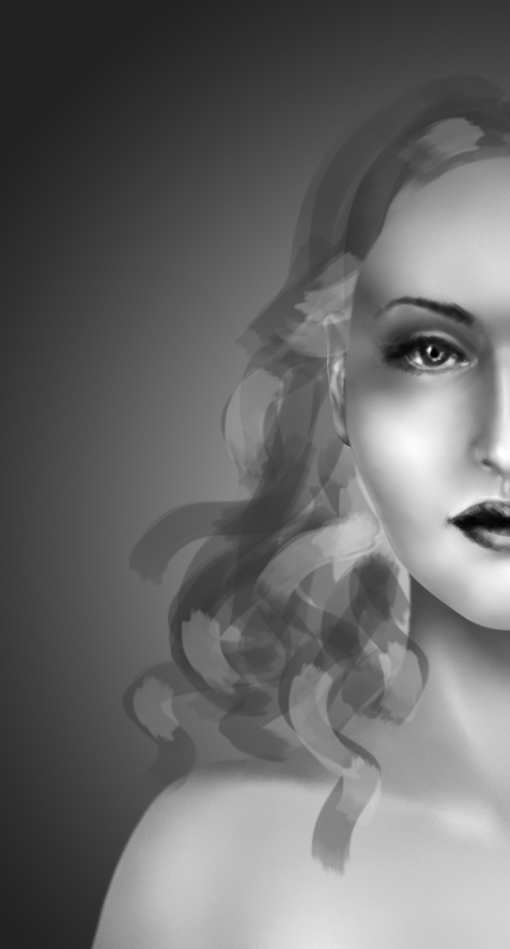 Casi allí. 🙂 Todo lo que queda por hacer es añadir un poco de pelo más suelto con un pequeño disco redondo pincel, la opacidad y el tamaño ajustado a la presión del lápiz. Pinté estos en su mayoría en blanco en las zonas iluminadas del cabello, añadiendo sólo pocos en negro.