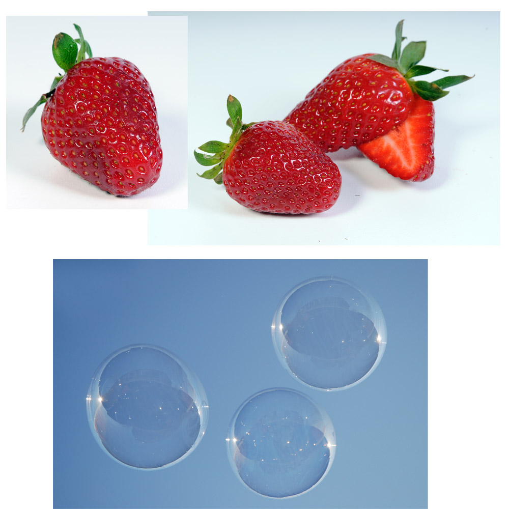 8. Ahora la fresa fondo se ha ido, me volví ambas capas de burbujas en las máscaras de capa. Hay una capa de burbujas que está en el modo normal y una capa que está en modo de superposición. Con las dos capas en modos de máscara de capa, he usado varios pinceles blandos en diferentes opacidades en las dos capas para obtener el fondo mostrar a través de, entonces terminé con esto: