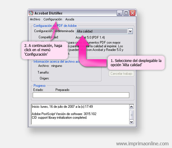 Una vez abierto, las opciones a tener en cuenta en Acrobat Distiller son las siguientes: