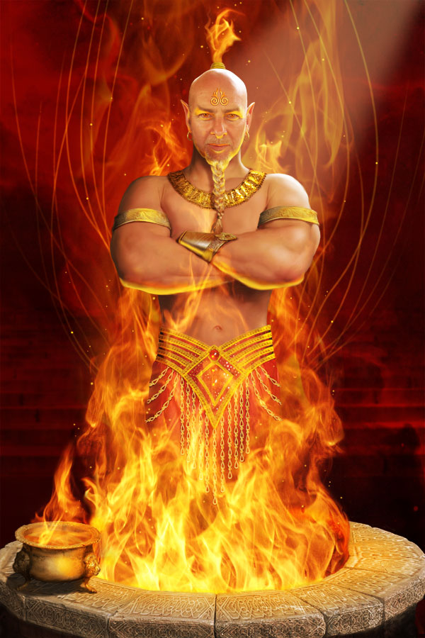 Puse la imagen de la llama bajo la capa de bien y por encima de la capa de figura y cambié el modo de fusión a la pantalla para que el fondo negro desapareció dejando sólo las llamas: