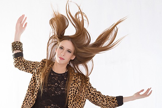 En el estudio se realizó una serie de fotografías en las que la modelo lanzaba su pelo al aire con las mano. Era un movimiento rápido y lógicamente no se podía controlar la forma que tomaba el pelo en cada toma. Luego, al realizar la selección, se vio que en la fotografía que contenía la mejor pose, el pelo mostraba una distribución partida a derecha e izquierda pero con un gran hueco en el centro. Para subsanarlo se extrajo pelo que había quedado con una forma muy bonita de otra foto de la sesión y se añadió a la fotografía seleccionada.