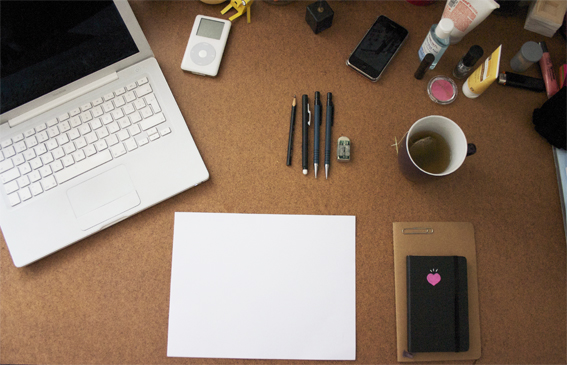Tip: Para que nuestro personaje no se vea “flotando” podemos agregar algunos objetos que den la sensación de suelo: en este caso, una taza de café, una croquera y pintitas en el suelo.